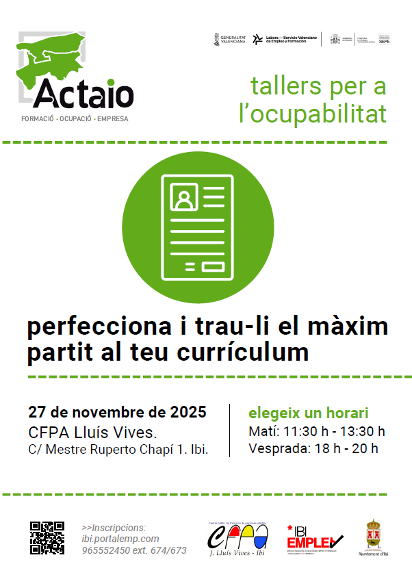 ACTAIO Y AYUNTAMIENTO DE IBI, en colaboración con el Centro de Formación de Personas Adultas de Ibi, organiza un taller práctico dirigido a personas en búsqueda de empleo que deseen mejorar su currículum y aumentar sus oportunidades laborales.