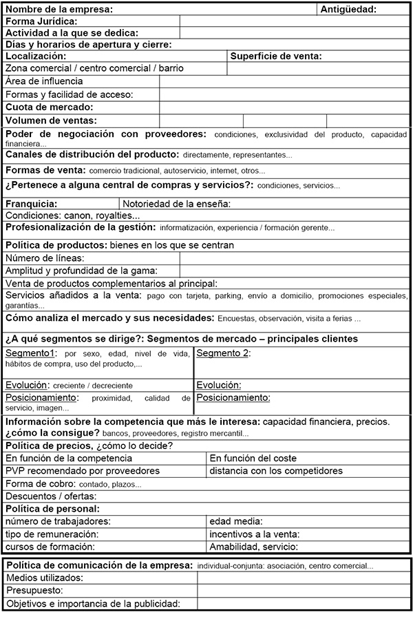 Una buena forma de analizar la competencia puede ser realizando una ficha para cada competidor, en la que consten las características más relevantes de este. Un ejemplo de ficha podría ser como el que sigue a continuación: