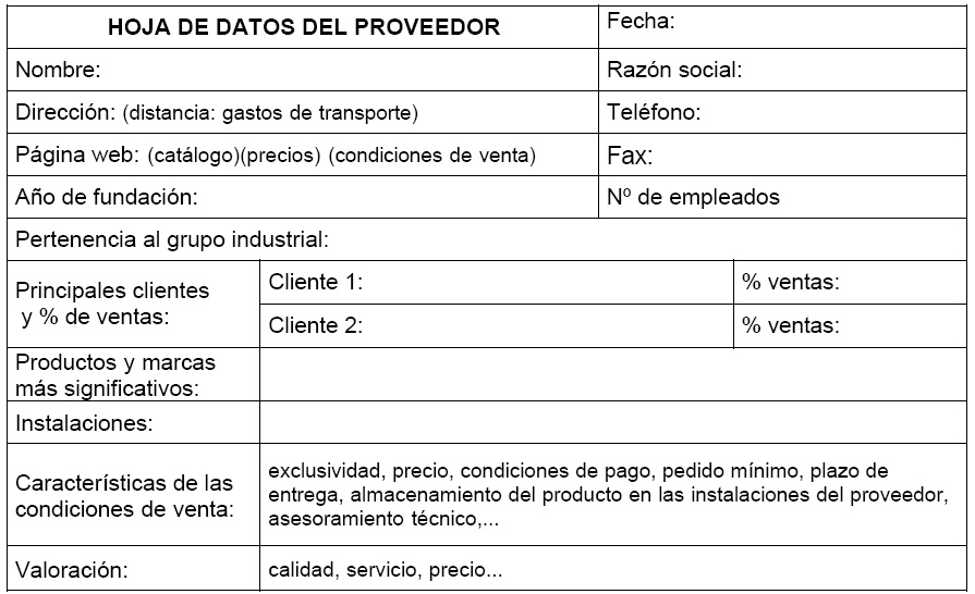 Primero deberemos buscar los principales proveedores de un sector y del tipo de producto de acuerdo al posicionamiento elegido. Esta información la podemos obtener a través de la visita a las principales ferias del sector, solicitando listados de fabricantes y mayoristas. Una vez que disponemos del listado de los principales proveedores es importante hacer una tabla para cada uno de los proveedores en la que aparezcan sus principales características. Un modelo podría ser como el que se presenta a continuación: