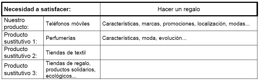 Se puede elaborar una tabla en la que se reflejen los productos sustitutivos que satisfacen la misma necesidad que los que nosotros ofrecemos para el segmento seleccionado, sus características y analizar como pueden afectar estos a nuestra empresa, así como saber cual es la razón por la que nuestros clientes potenciales prefieran satisfacer un necesidad con nuestro producto y no con otro sustitutivo o al revés.. Ejemplo: