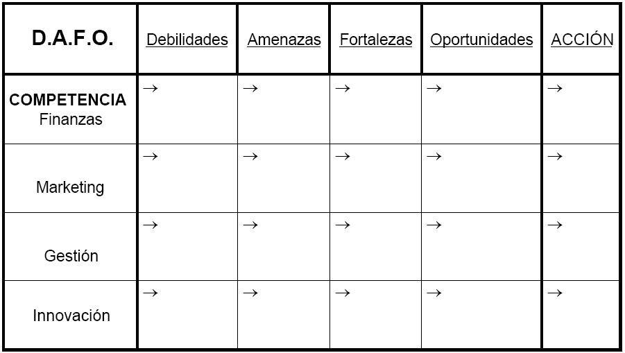 - Oportunidades y puntos débiles: Corregiremos esa causa de debilidad para aprovechar esa oportunidad que surja en el mercado.